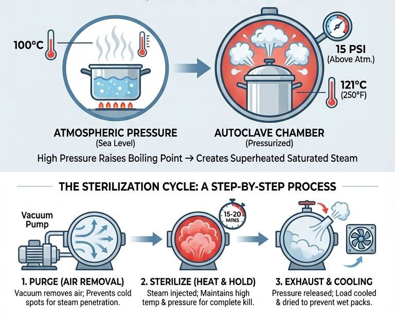 그래서 1기압 정도의 압력(15psi)을 더 가해 더 높은 온도인 121도 정도의 수증기를 만들어 15분에서 30분정도 멸균을 하게 됩니다