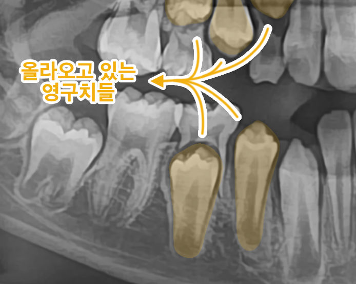 영구치가 얼마나 올라왔나, 유치 뿌리는 얼마나 올라왔나 확인할 수도 있으며