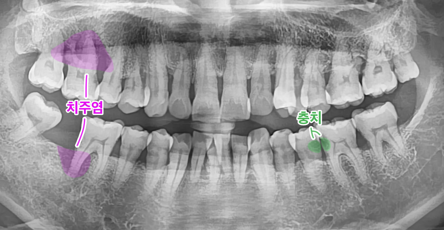 파노라마 엑스레이 한장 만으로 모든 것을 알아낼 수 있는 것은 아니며, 예를 들면 파노라마 엑스레이에 보이지 않는 치아우식(충치)도 얼마든지 있을 수 있습니다